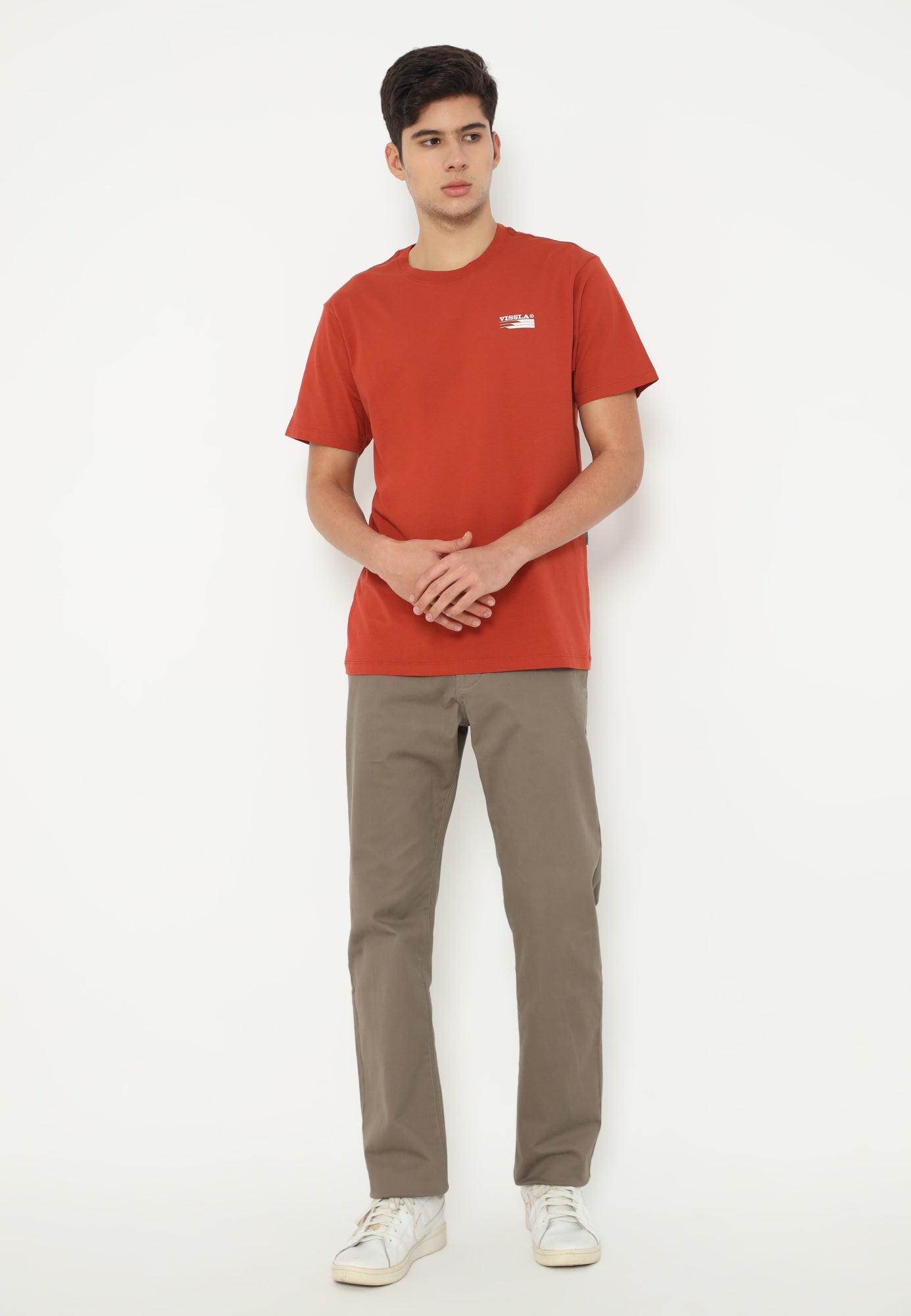 - desain print kecil dada depan dan berukuran besar di bagian belakang